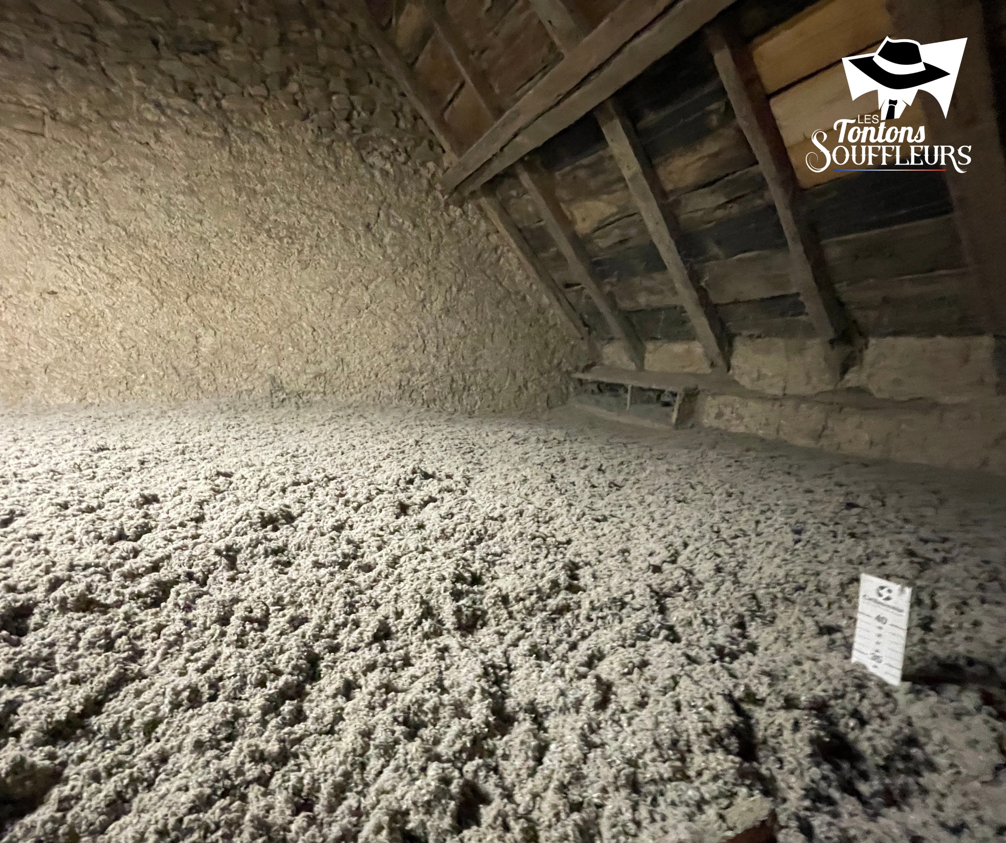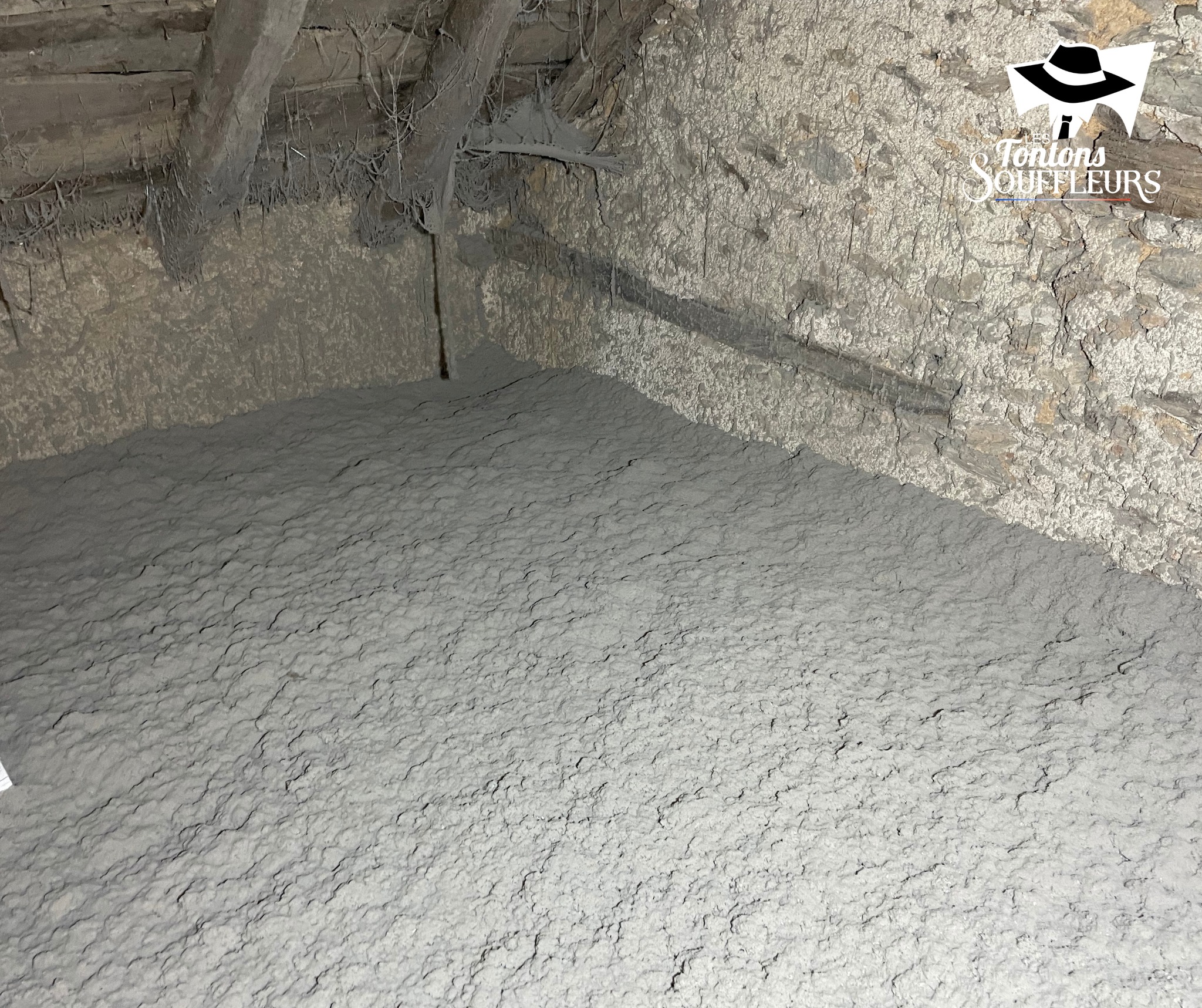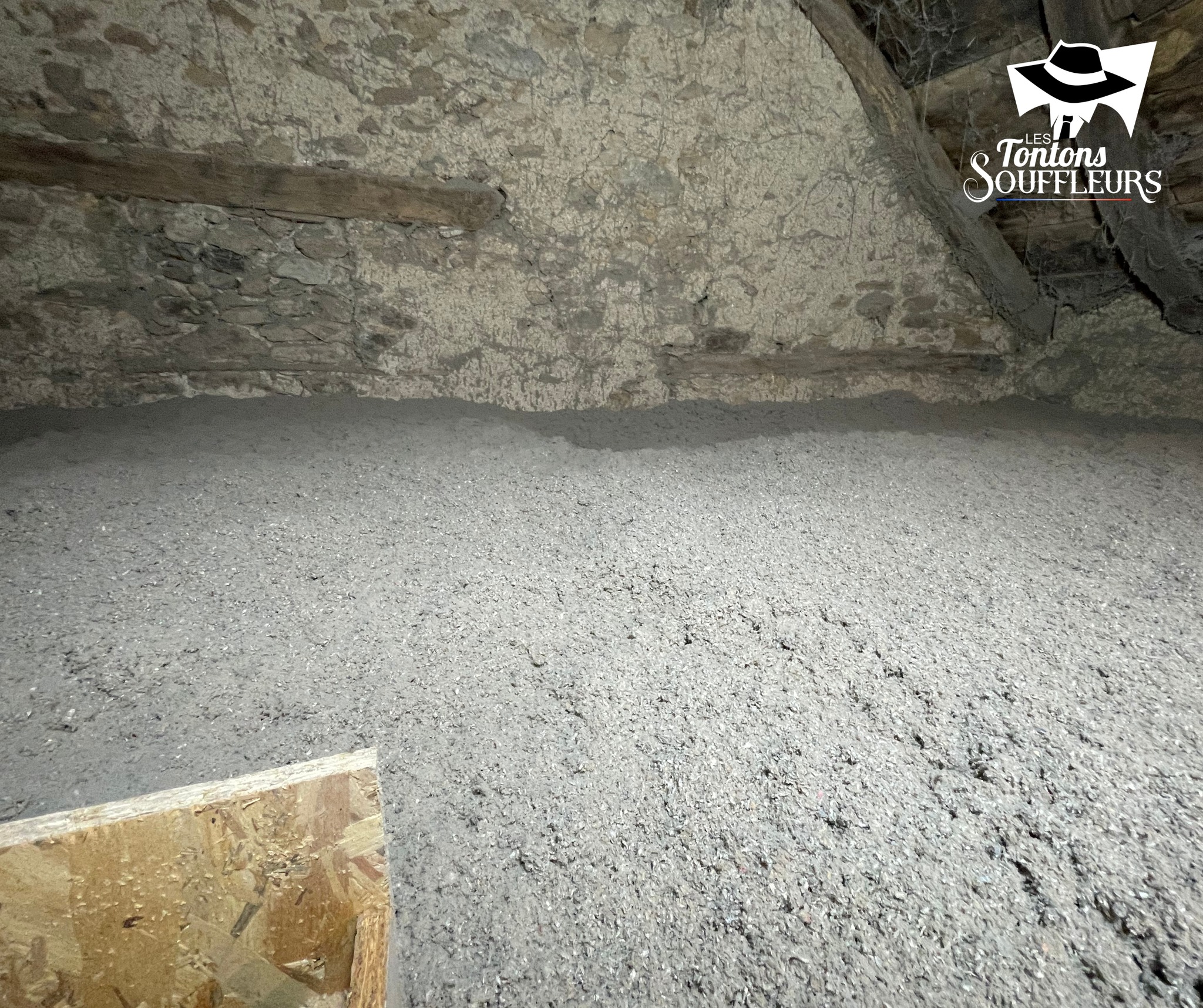 Avant de poser un nouvel isolant, un nettoyage complet des combles a été réalisé. Il est essentiel de repartir sur une base saine pour garantir une installation durable et homogène. Une fois la préparation terminée, nous avons procédé au soufflage de 35 cm de ouate de cellulose Igloo France, permettant d’atteindre une résistance thermique R = 7. Ce niveau de performance correspond aux standards actuels de la rénovation énergétique et assure une isolation efficace aussi bien en hiver qu’en été.