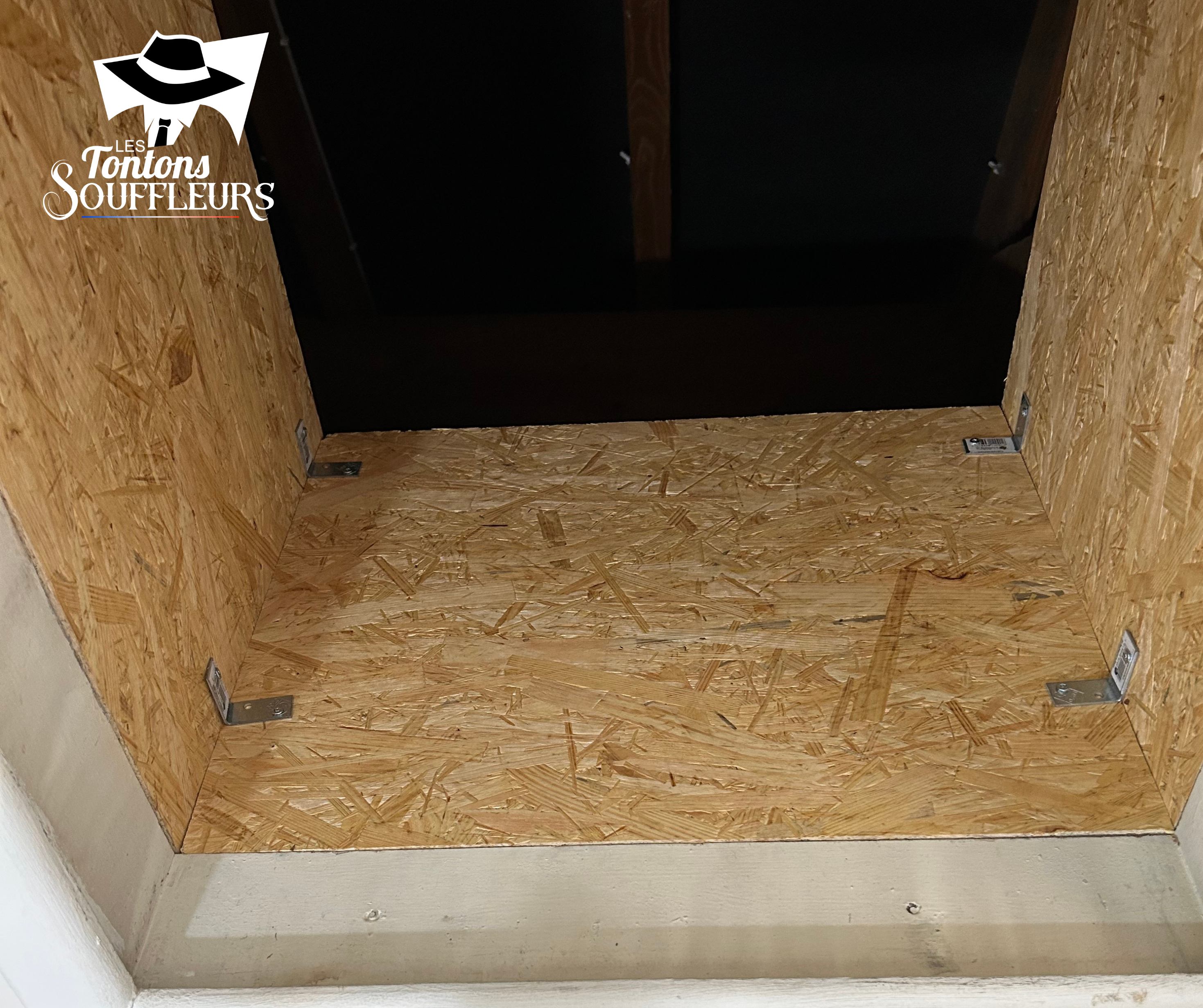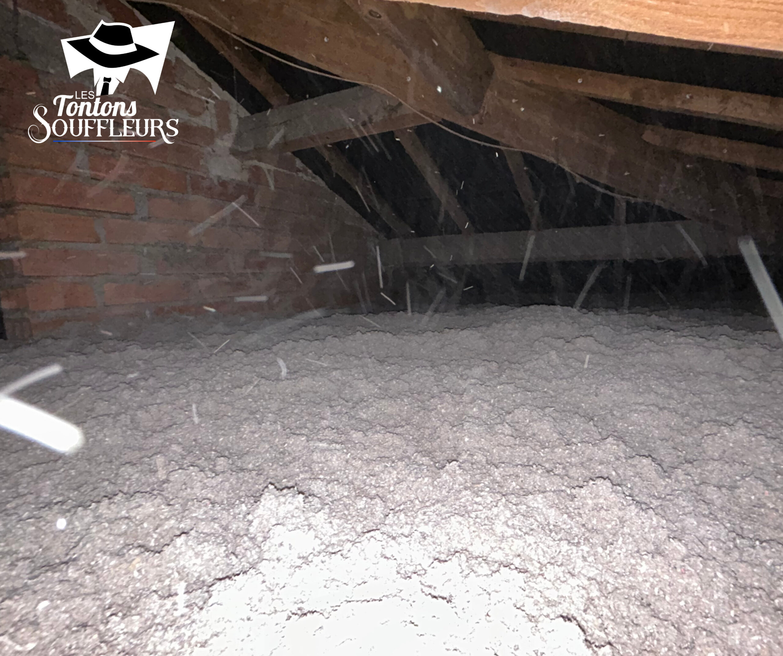 L’isolation du plancher a été réalisée au moyen d’un soufflage homogène de ouate de cellulose, un isolant naturel, performant et durable, idéal pour réduire les ponts thermiques et améliorer le confort toute l’année.