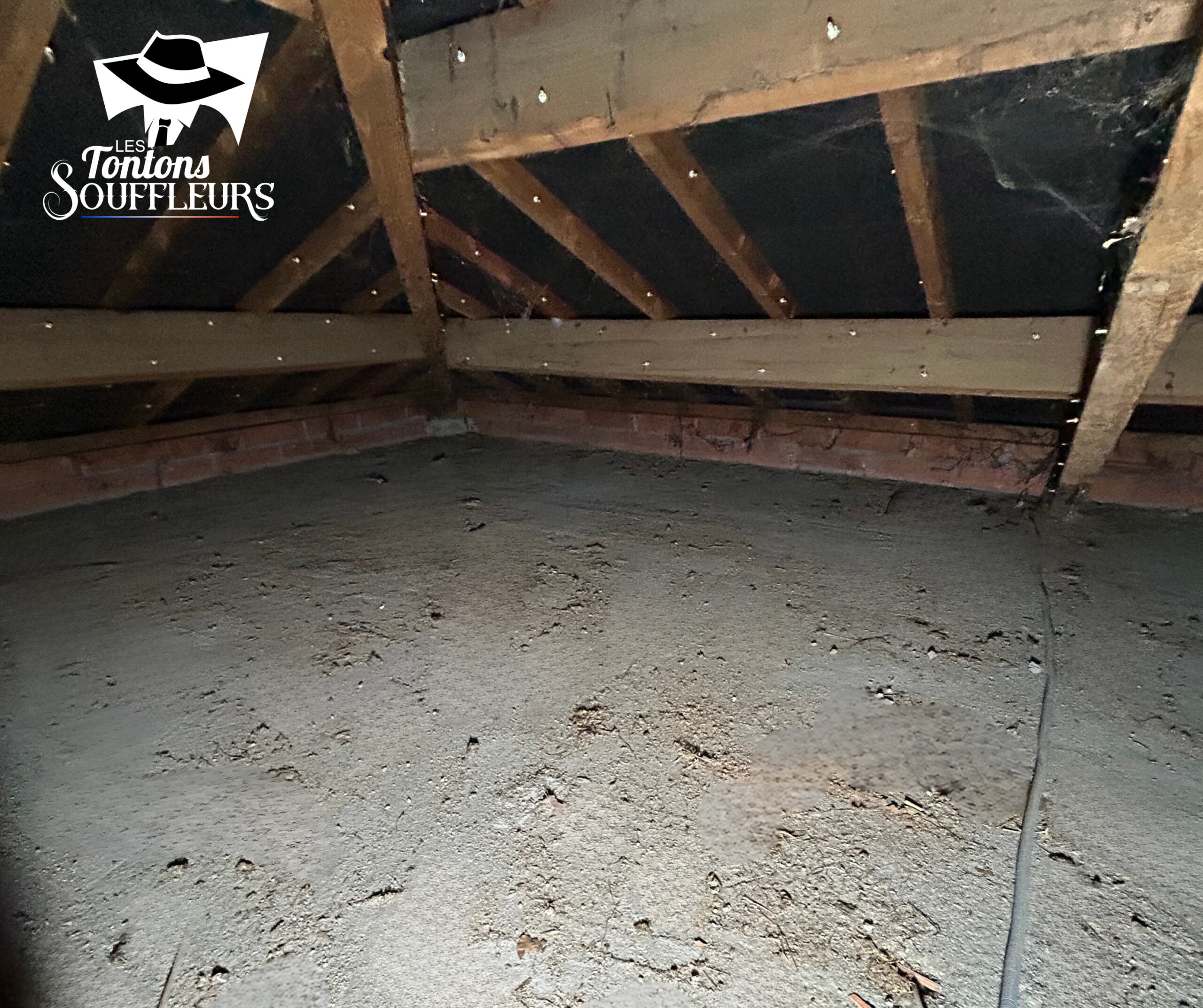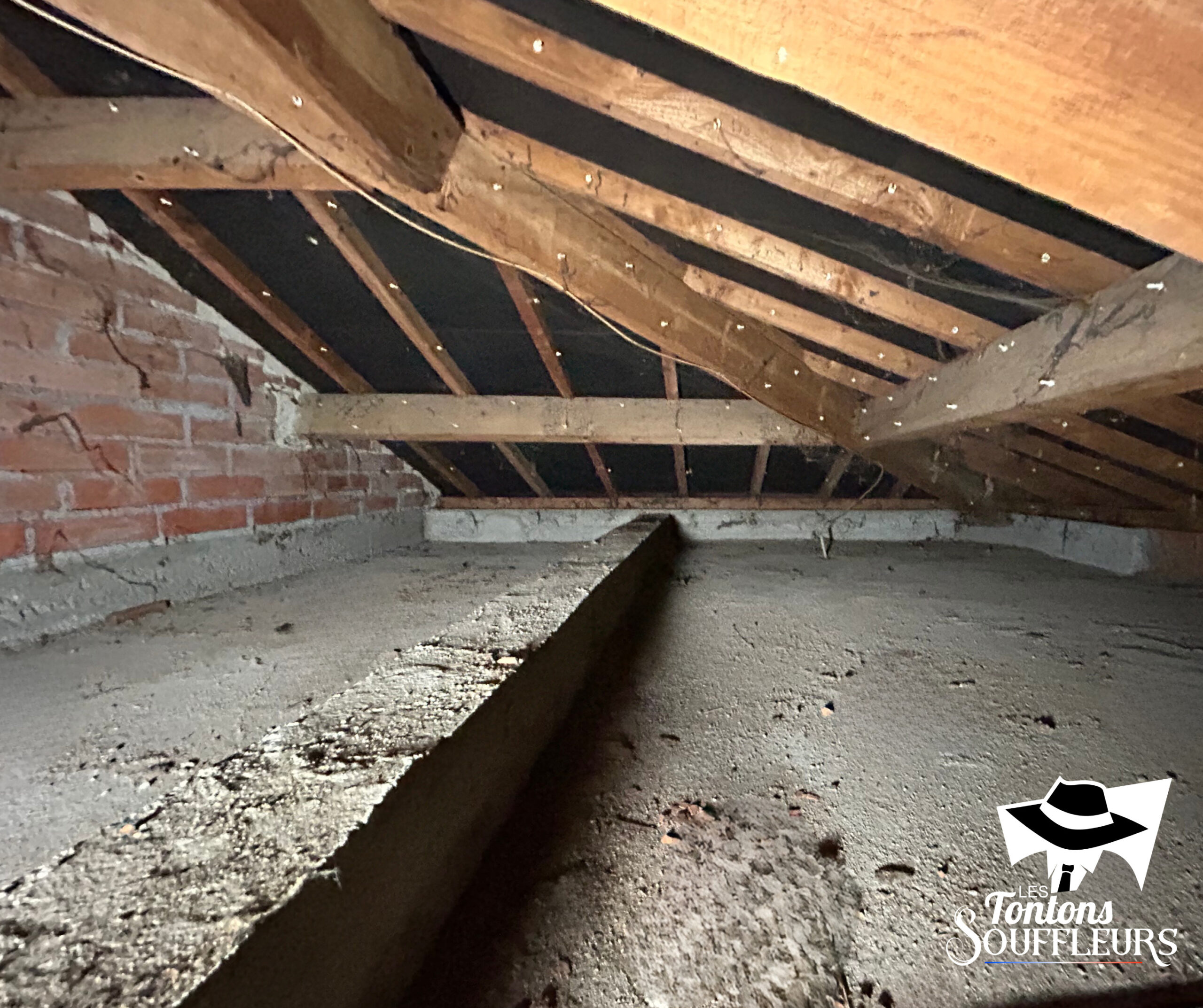 L’ancienne laine de verre en rouleaux a été retirée et évacuée, permettant d’assainir complètement le comble avant de procéder à une isolation performante.