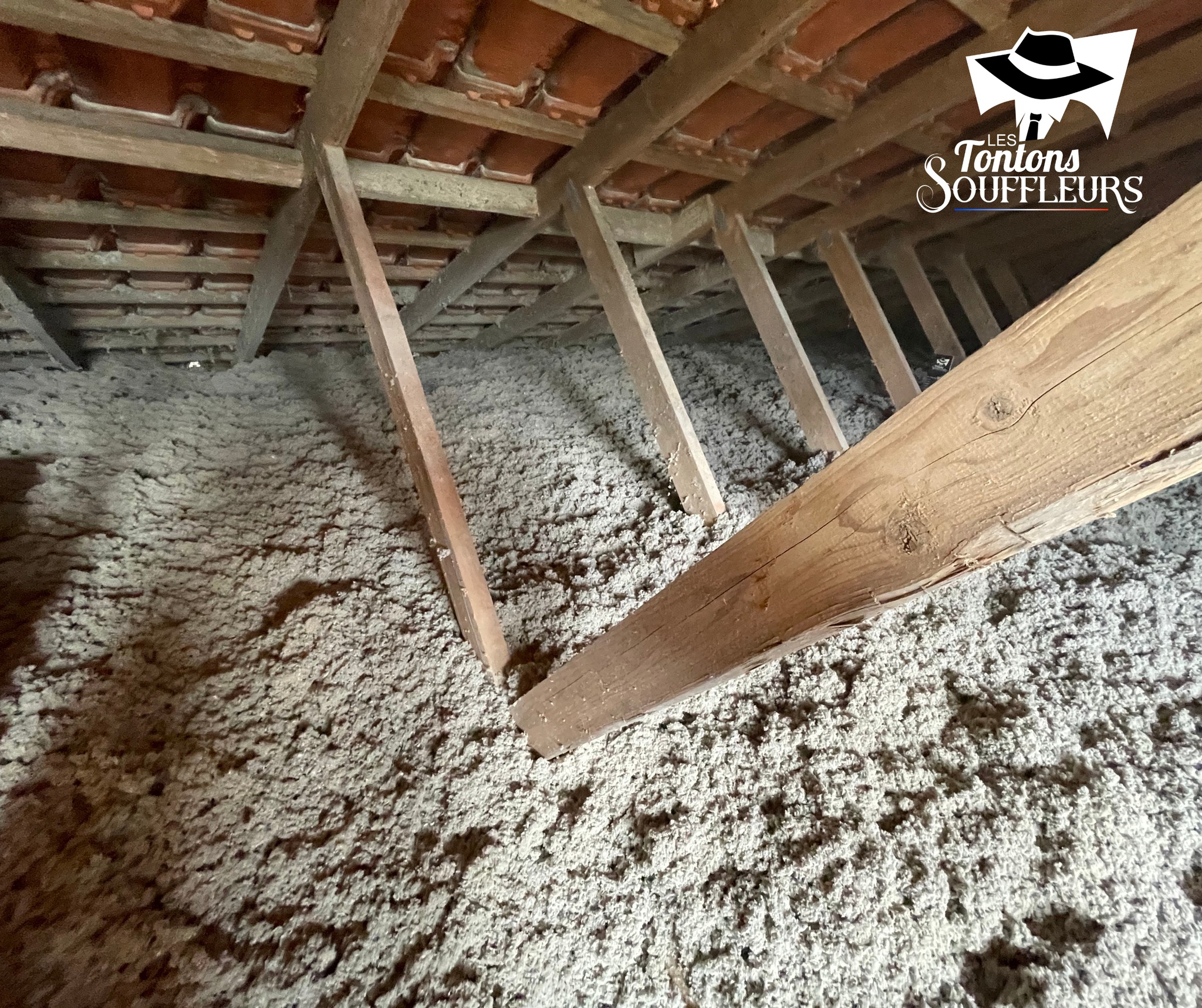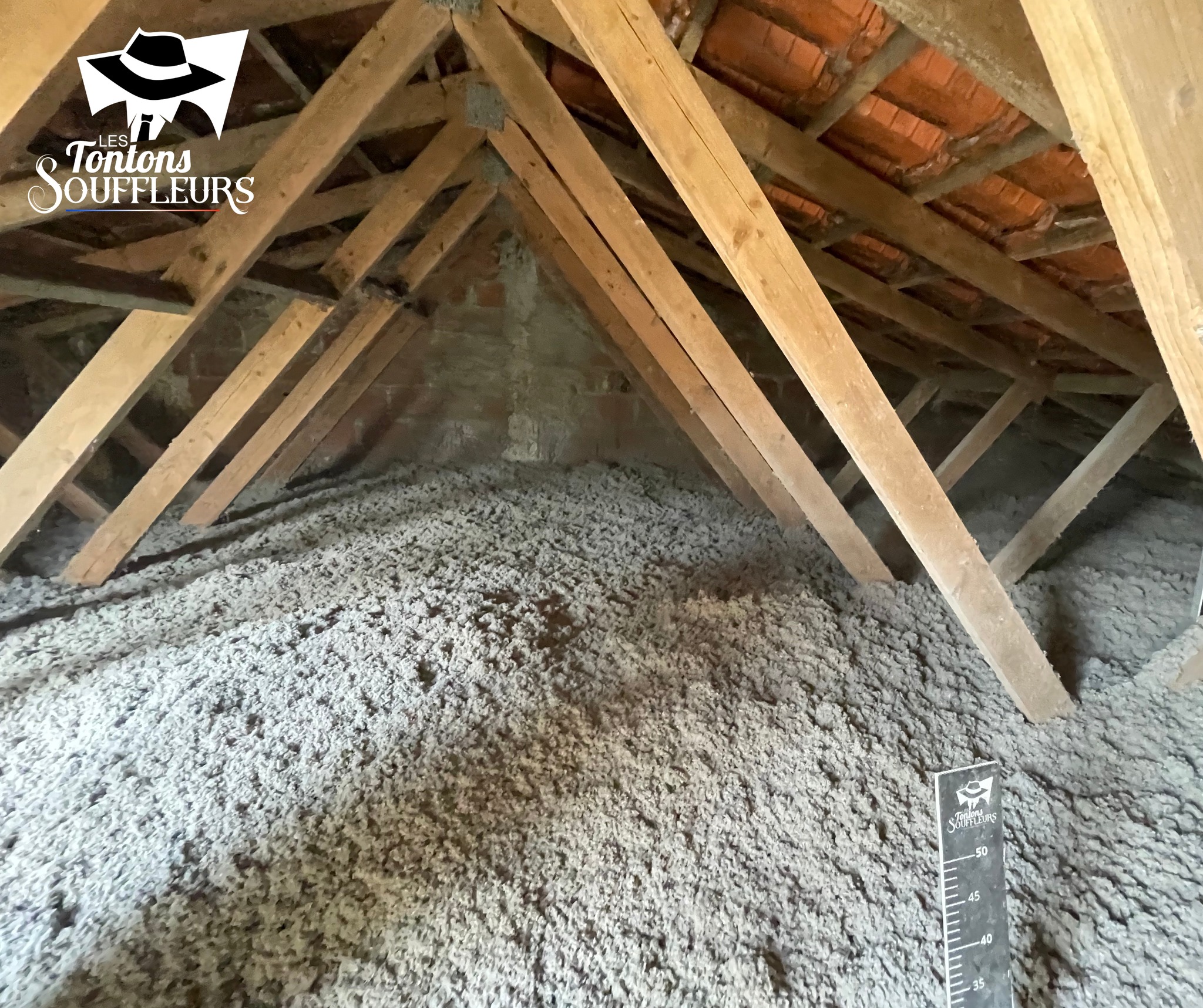Une fois la logistique installée, nous avons procédé au double soufflage de ouate de cellulose IGLOO, atteignant une résistance thermique R7 dans les combles perdus des deux habitations.