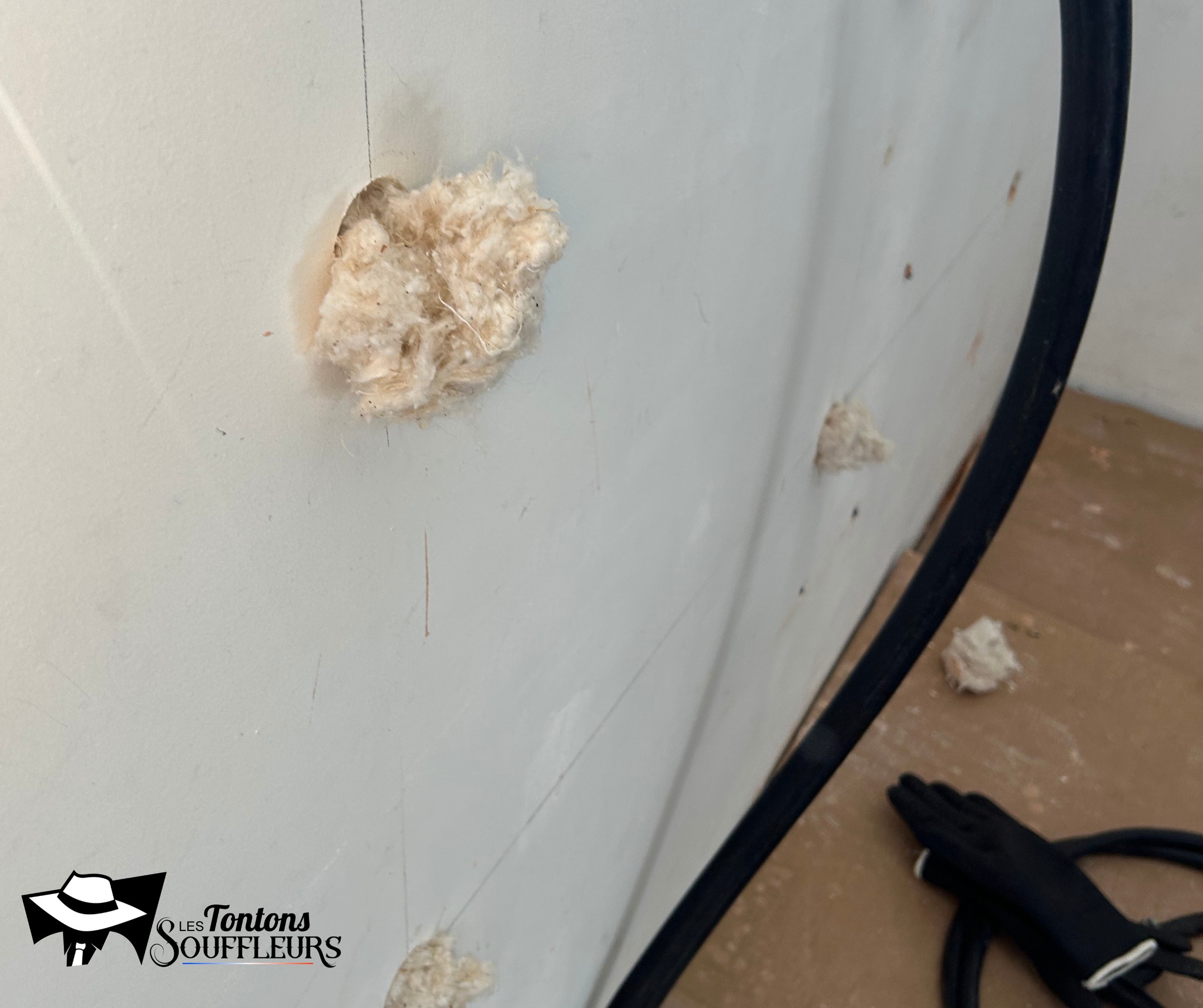 Pour ce chantier à Plaisance-du-Touch, nous avons mis en œuvre le système Inject Styrene, une technique d’isolation par injection de billes isolantes spécialement conçue pour la rénovation. Le principe est simple mais redoutablement efficace : après un diagnostic précis des parois, de petites perforations discrètes sont réalisées afin d’injecter les billes isolantes sous pression directement dans les cavités des murs.