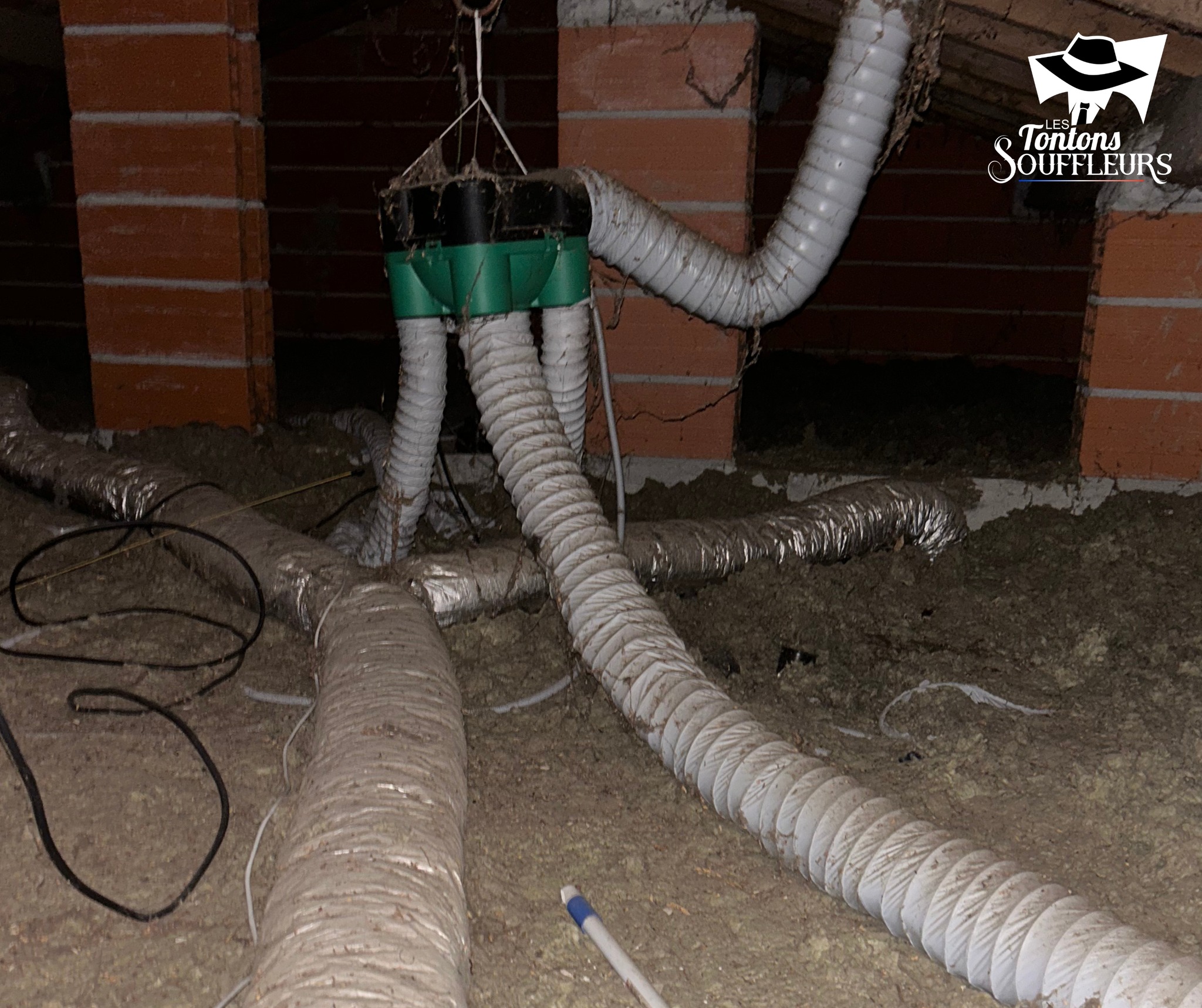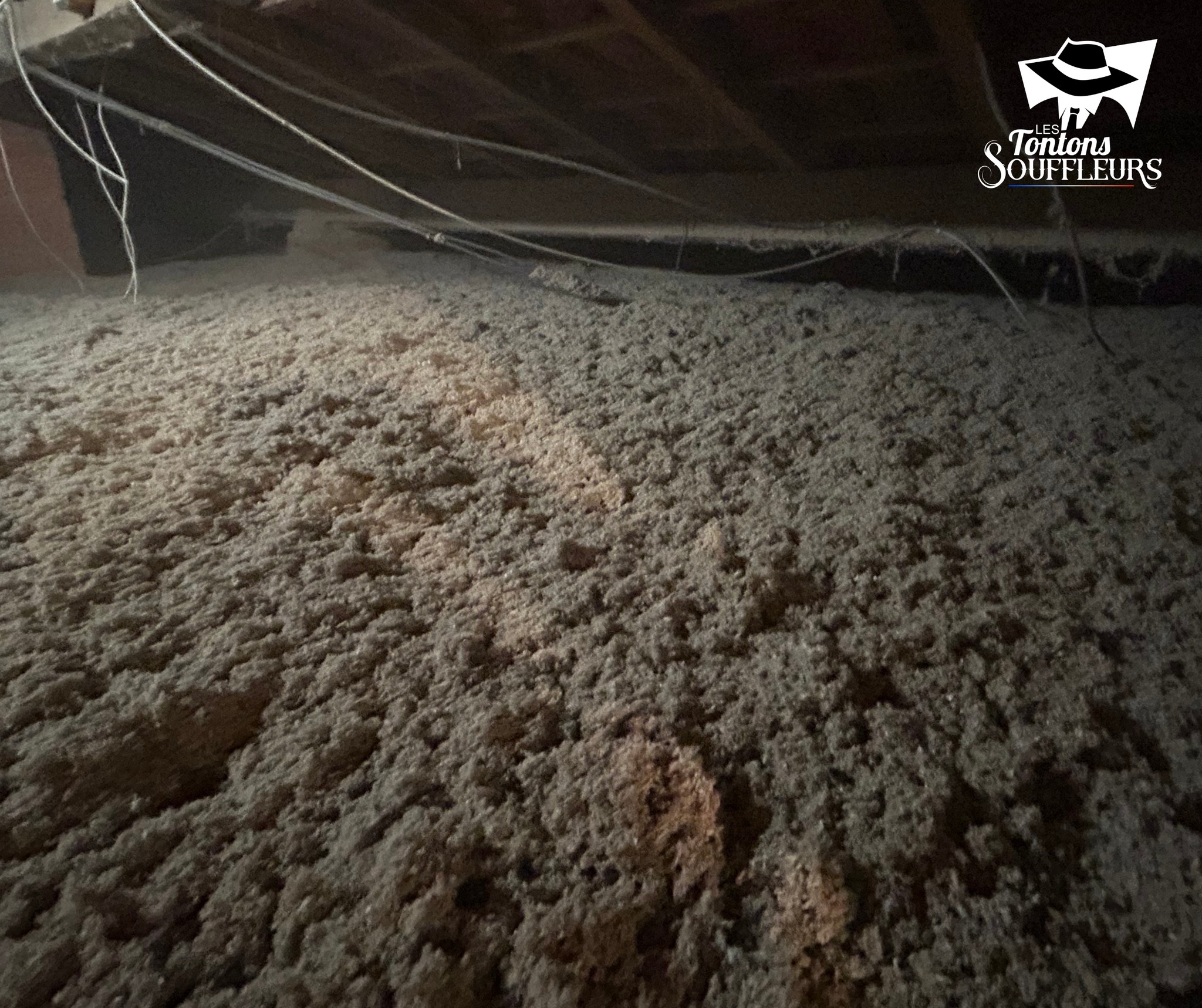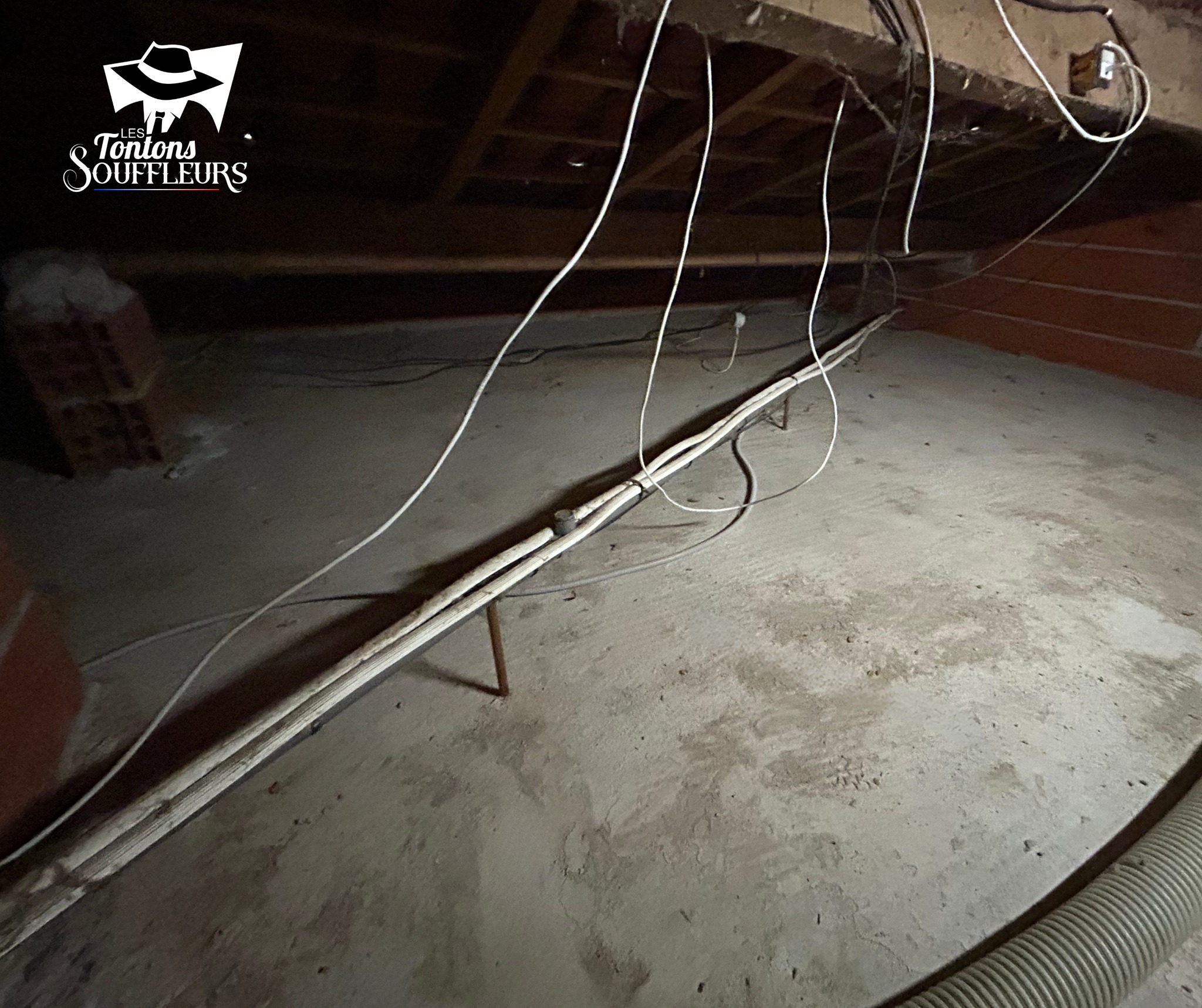 Une fois les combles nettoyés, place à la performance ! Nous avons réalisé un soufflage de ouate de cellulose afin d’atteindre une résistance thermique R7, conforme aux standards actuels de rénovation énergétique.