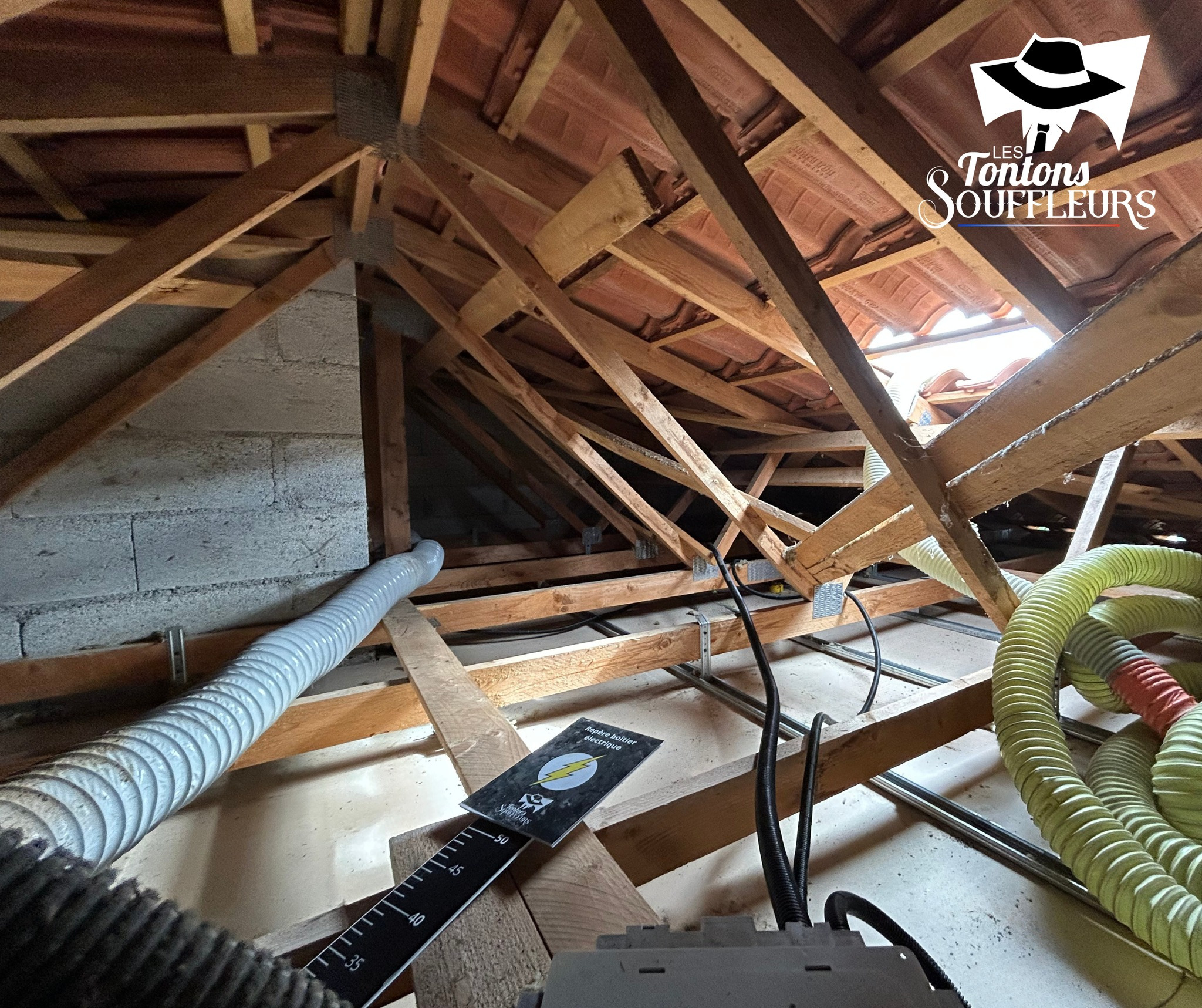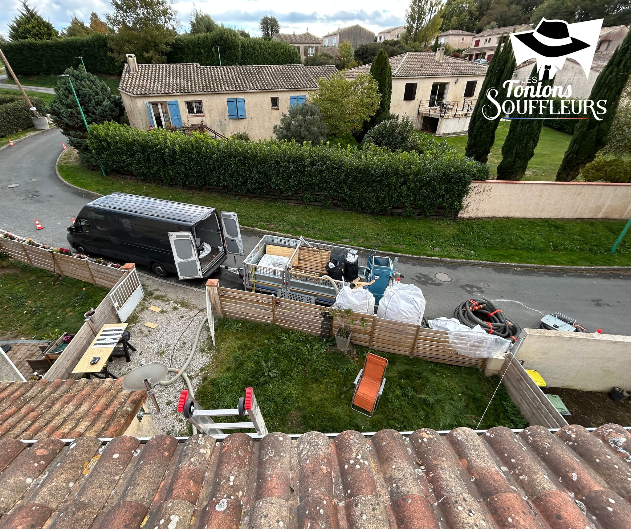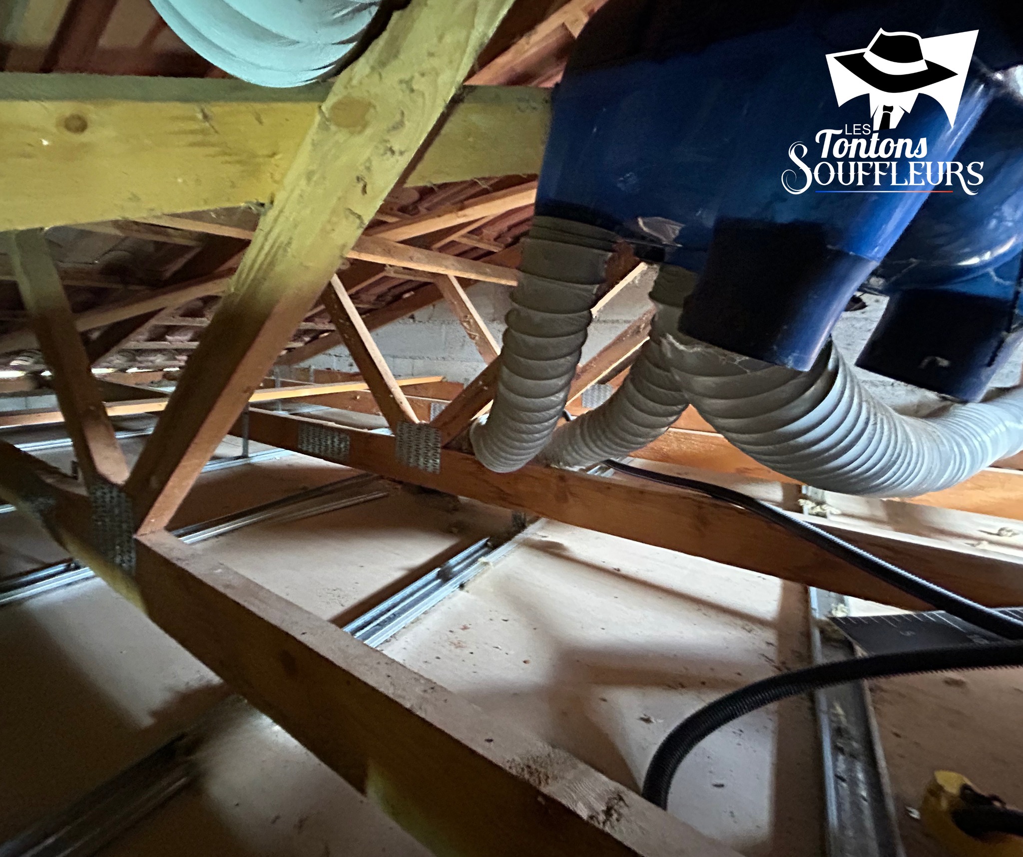 Sur ce chantier, les Tontons ont réalisé l’aspiration de l’ancien isolant suivie du soufflage d’une nouvelle isolation en ouate de cellulose, le tout dans la même journée, afin de réduire au maximum la gêne pour les occupants.