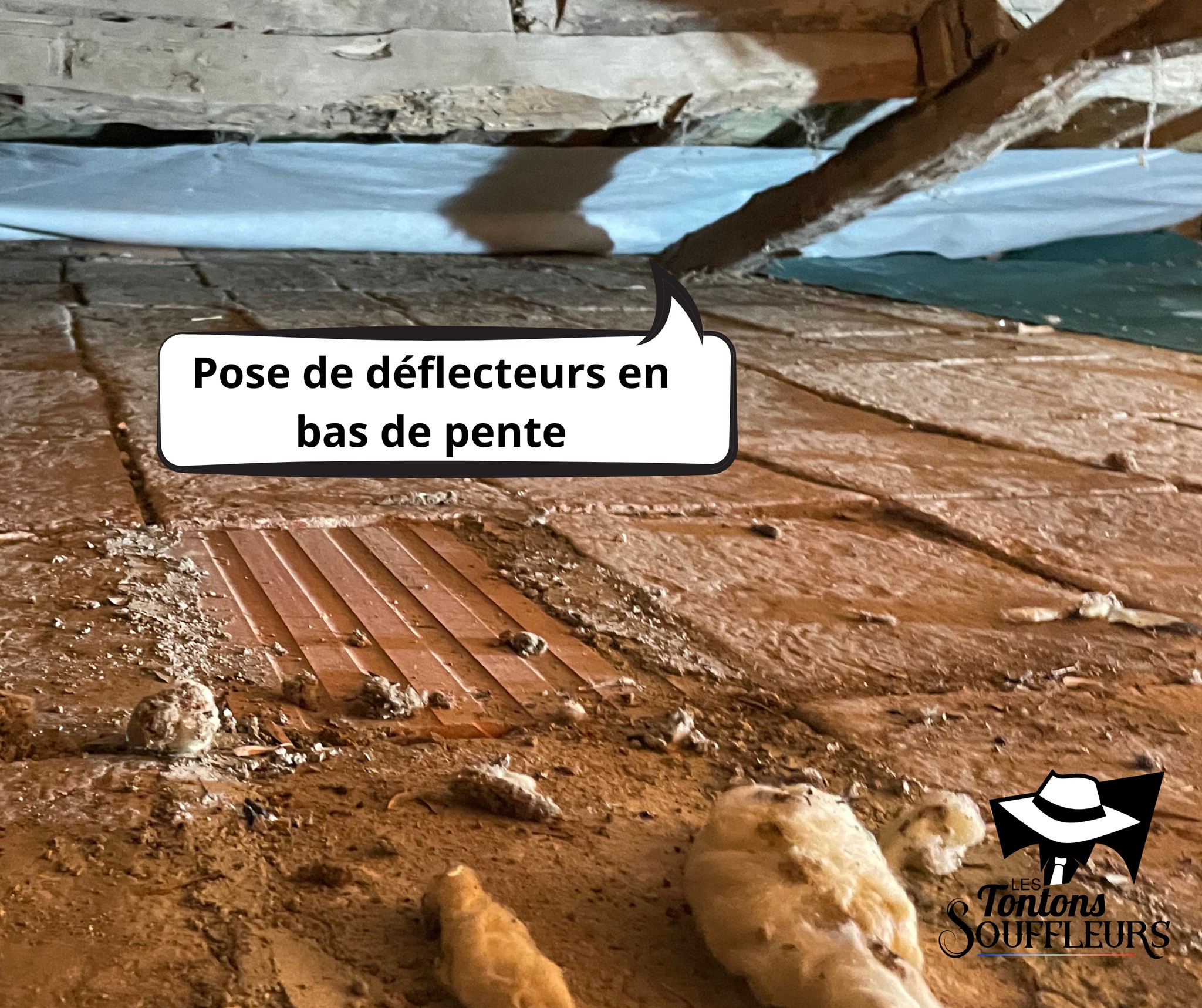 Pose de déflecteurs en bas de pente pour éviter que l’isolant ne touche les tuiles. Cette étape est obligatoire pour garantir la longévité de l’isolant et la ventilation correcte des combles.