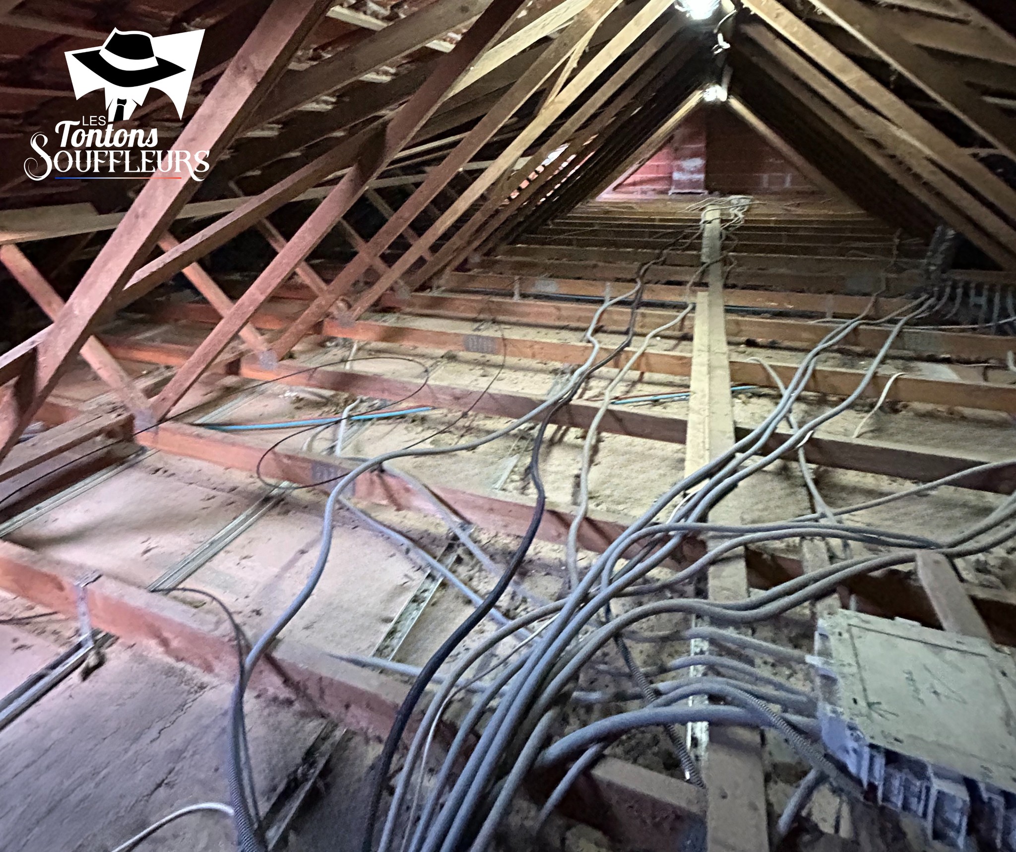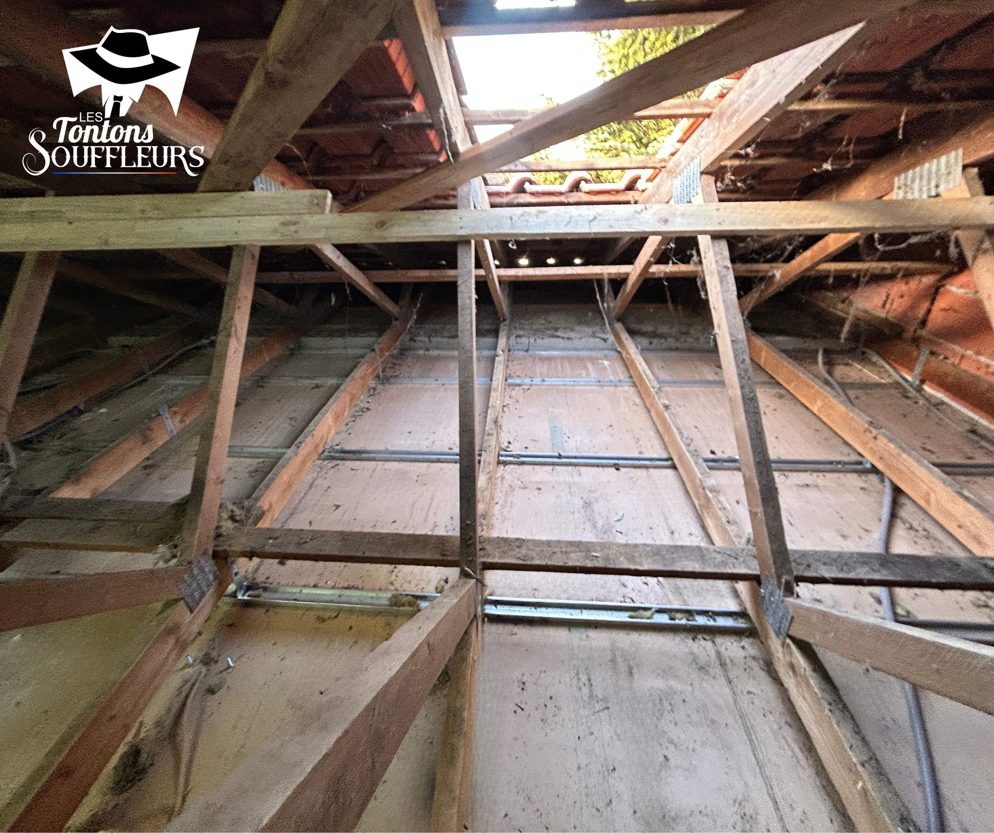 Avant toute mise en place d’un nouvel isolant, les équipes des Tontons Souffleurs ont commencé par préparer soigneusement les combles.