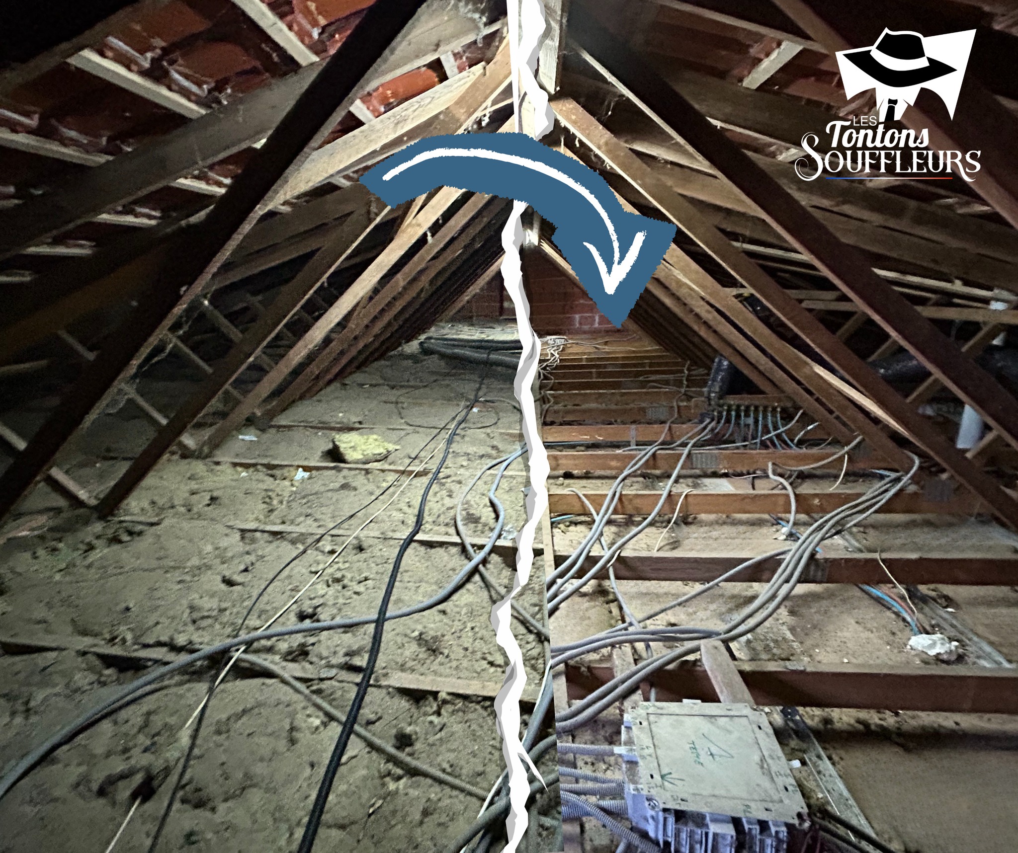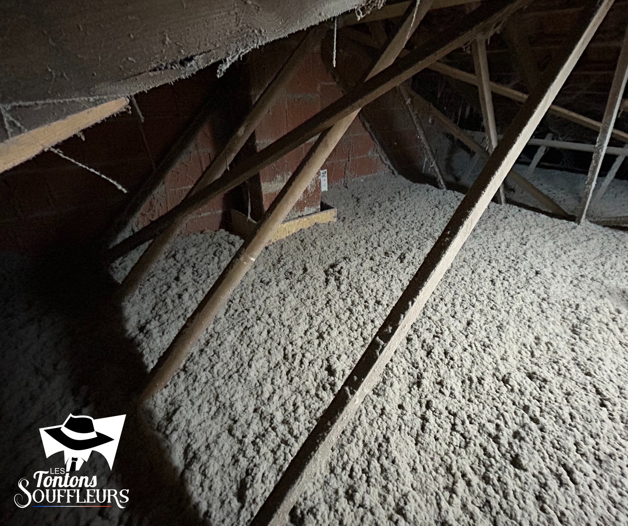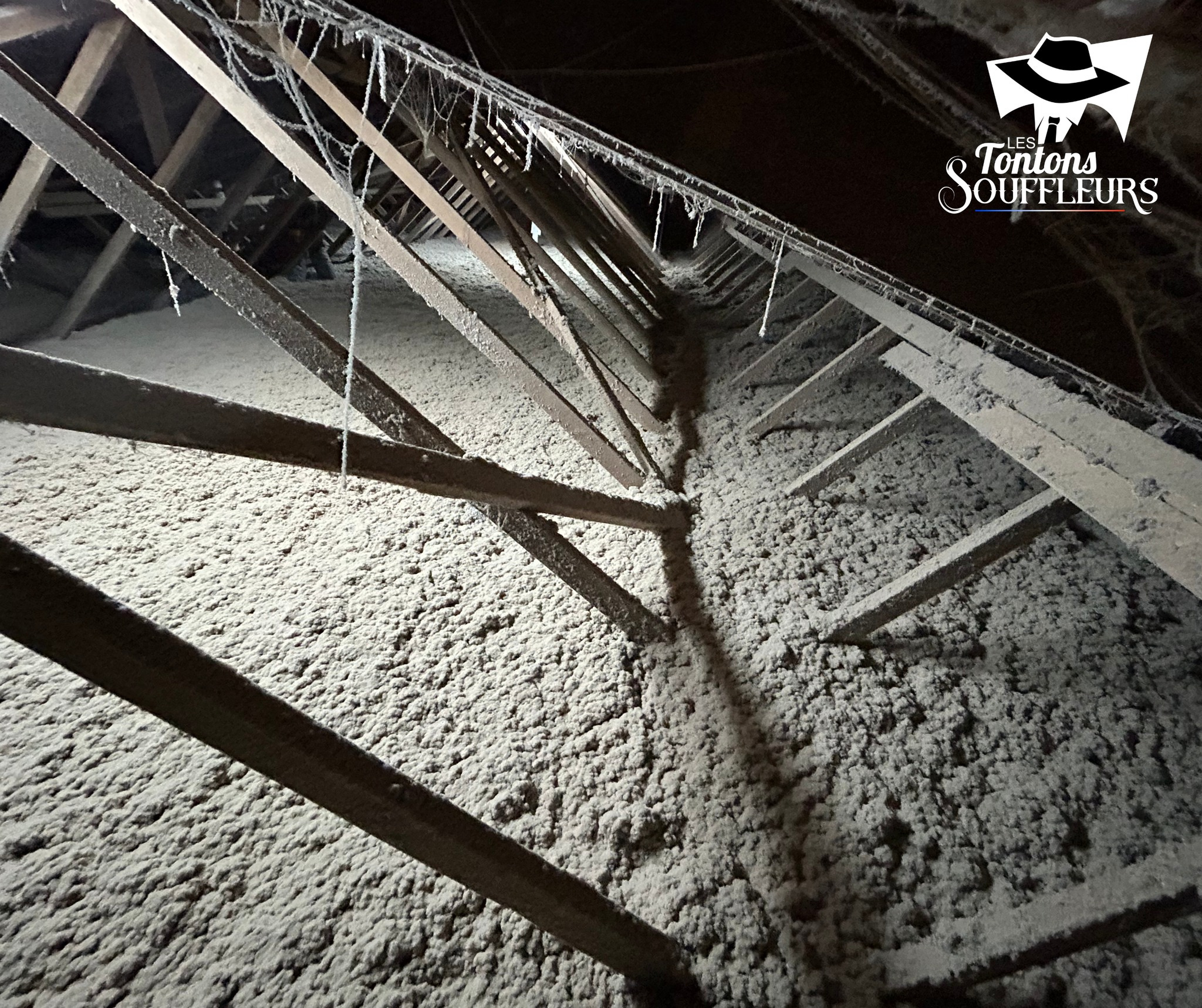 Après une dépose de l’ancien isolant réalisée par le propriétaire lui-même, les Tontons Souffleurs sont entrés en scène pour préparer les combles et réaliser une isolation performante en ouate de cellulose Igloo.