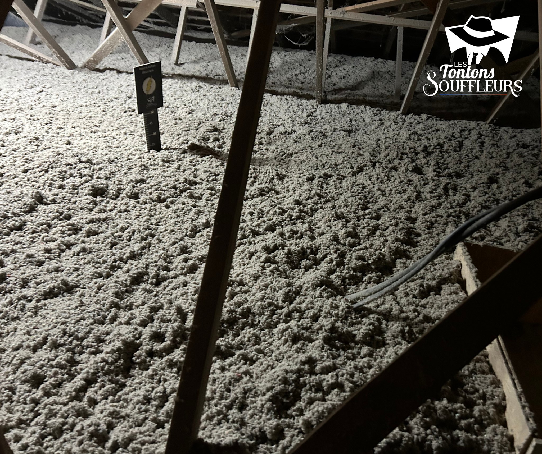 Une fois les combles préparés, les Tontons ont procédé au soufflage de ouate de cellulose Igloo, un isolant écologique particulièrement efficace pour l’isolation des combles perdus.